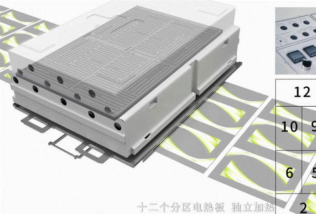 - 十二個(gè)區(qū)電熱板,配有定時(shí)啟動(dòng)溫控器功能,每區(qū)溫度可單獨(dú)控制調(diào)節(jié);